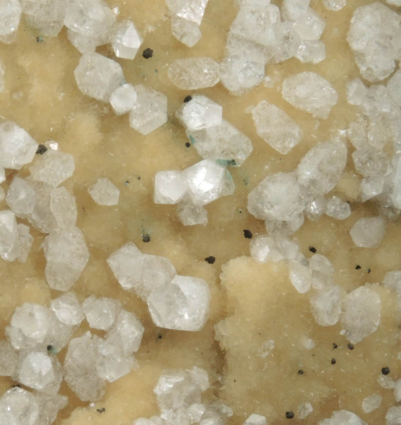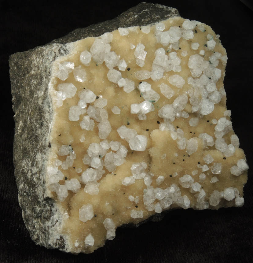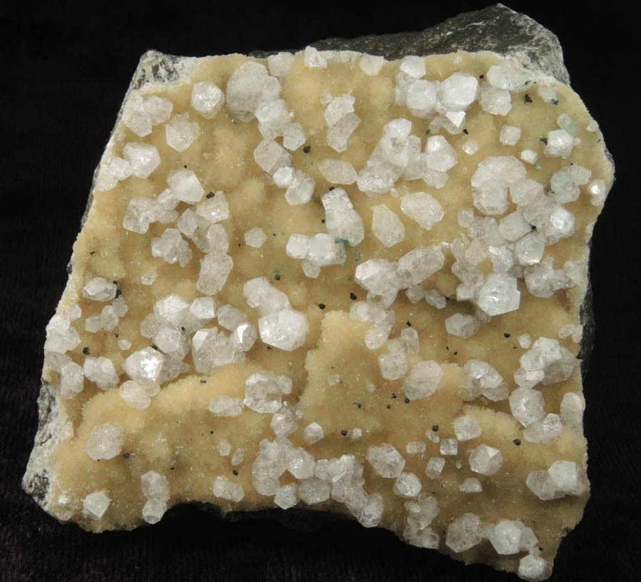 | Description: | Lustrous transparent-to-translucent colorless apophyllite crystals to 6 mm on beige-colored bladed stilbite crystals to 1 mm completely coating one face of dark-gray fine-grained diabase, plus scattered black goethite or chamosite microcrystals. Ex. R. Rybnicky collection, acquired in 1991 at Franklin NJ show; collected by Nick Facciolla (1907-2008), author of Minerals of Laurel Hill, N.J. |