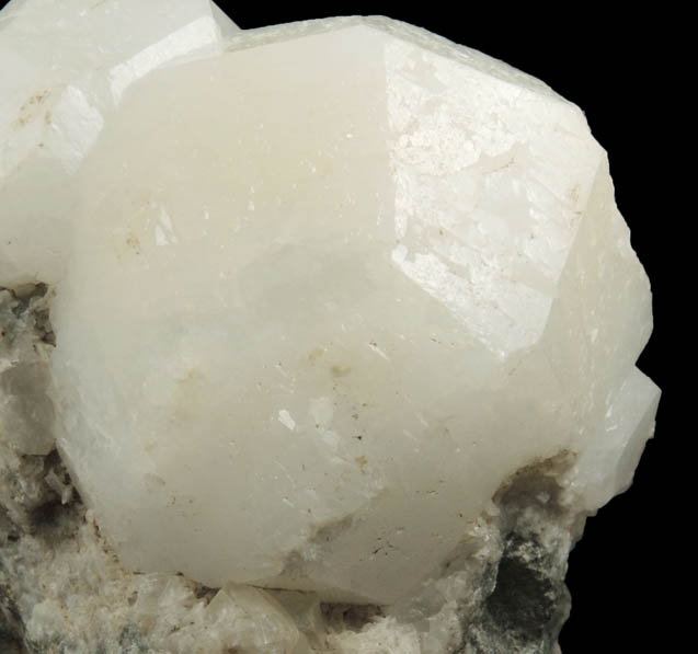 | Description: | Unusually large lustrous translucent white trapezohedral analcime crystals to 35 mm on greenish basalt. One corner of the largest analcime crystal has a crystallized impression (contact) from another crystal that it intersected. Ex. Robert (Bob) Horn collection |