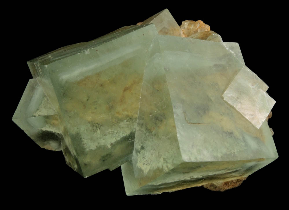 | Description: | Lustrous transparent green cubic fluorite crystals with white phantom-growth zoned inclusions. The internal clarity of the fluorite crystals is remarkable, making the matrix on the bottom visible through the fluorite crystals. Ex. Marshall Sussman |