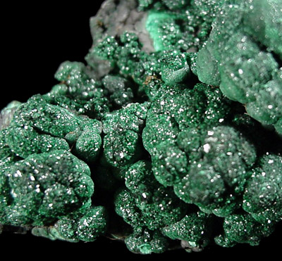 | Description: | Deep green malachite crystals to 1 mm in large botryoidal formations to 1 cm. |