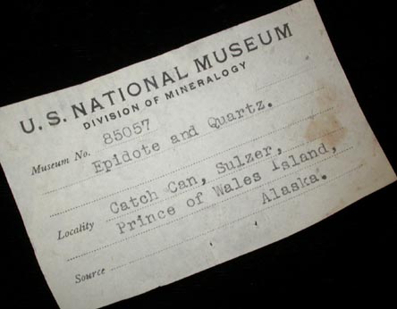 | Description: | Large prismatic green-black epidote crystals to 40 mm twinned on {111} plane with transparent colorless quartz crystals to 11 mm. See article: Famous Mineral Localities - Prince of Wales Island in Min. Rec., v.8 #1. Ex. U.S. National Museum (Smithsonian) #85057, collected during 1935 Smithsonian expedition |