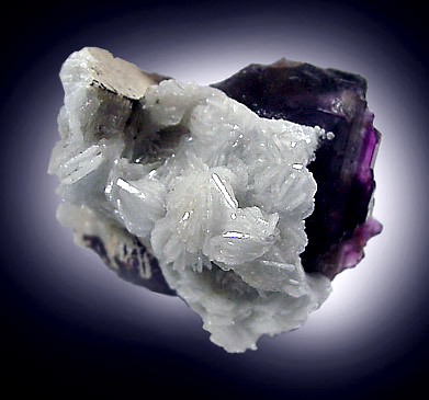 | Description: | White bladed crystals of lustrous barite to 4 mm on edge over purple fluorite matrix. |