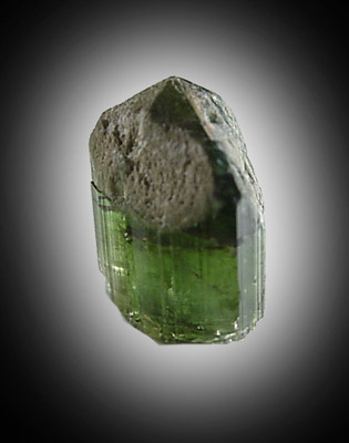| Description: | Single crystal of transparent green elbaite tourmaline with steep pyramidal termination. Minor cookeite attached can be easily removed. Collected ca. 1904 by Loren Merrill. |